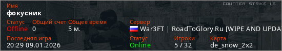 Играет на Counter Strike 1.6 сервере. Страна: РоссияПервый раз замечен 20:22 09.01.2026
