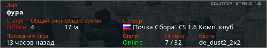 Играет на Counter Strike 1.6 сервере. Страна: РоссияПервый раз замечен 09:04 20.04.2026