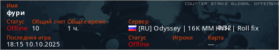 Играет на Counter Strike Global Offensive сервере. Страна: РоссияПервый раз замечен 22:16 25.08.2025