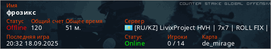 Играет на Counter Strike Global Offensive сервере. Страна: КазахстанПервый раз замечен 00:57 19.08.2025
