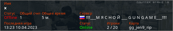 Играет на Counter Strike 1.6 сервере. Страна: РоссияПервый раз замечен 13:03 10.04.2023