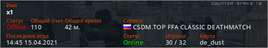 Играет на Counter Strike 1.6 сервере. Страна: РоссияПервый раз замечен 10:52 03.02.2021