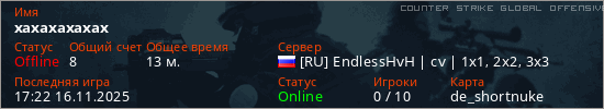 Играет на Counter Strike Global Offensive сервере. Страна: РоссияПервый раз замечен 13:03 14.11.2025