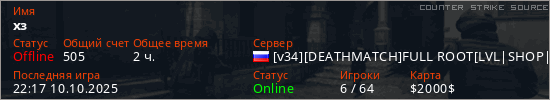 Играет на Counter Strike Source сервере. Страна: РоссияПервый раз замечен 08:12 09.03.2023