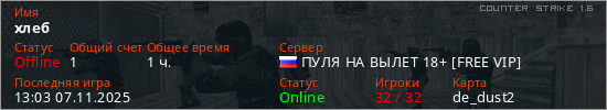 Играет на Counter Strike 1.6 сервере. Страна: РоссияПервый раз замечен 19:33 18.09.2025