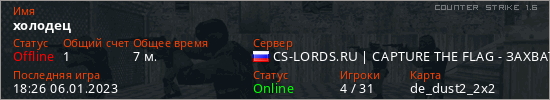 Играет на Counter Strike 1.6 сервере. Страна: РоссияПервый раз замечен 18:22 06.01.2023