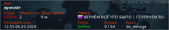 Играет на Counter Strike Global Offensive сервере. Страна: РоссияПервый раз замечен 12:14 06.03.2026
