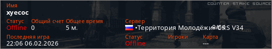 Играет на Counter Strike Source сервере. Страна: РоссияПервый раз замечен 21:18 06.02.2026