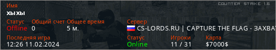 Играет на Counter Strike 1.6 сервере. Страна: РоссияПервый раз замечен 12:24 11.02.2024