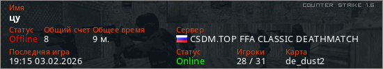 Играет на Counter Strike 1.6 сервере. Страна: РоссияПервый раз замечен 19:04 03.02.2026