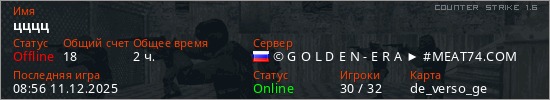 Играет на Counter Strike 1.6 сервере. Страна: РоссияПервый раз замечен 15:32 11.04.2023