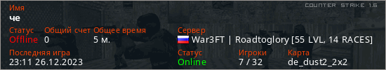Играет на Counter Strike 1.6 сервере. Страна: РоссияПервый раз замечен 23:09 26.12.2023
