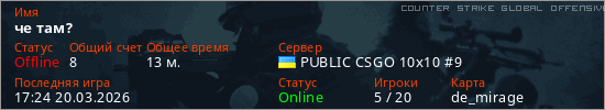 Играет на Counter Strike Global Offensive сервере. Страна: УкраинаПервый раз замечен 18:46 06.03.2026
