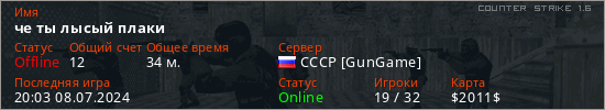 Играет на Counter Strike 1.6 сервере. Страна: РоссияПервый раз замечен 15:47 18.05.2024