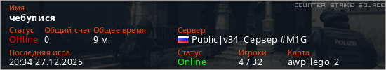 Играет на Counter Strike Source сервере. Страна: РоссияПервый раз замечен 16:51 27.12.2025