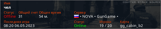 Играет на Counter Strike Source сервере. Страна: РоссияПервый раз замечен 18:35 08.10.2022
