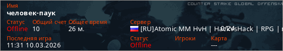 Играет на Counter Strike Global Offensive сервере. Страна: РоссияПервый раз замечен 18:41 06.03.2026