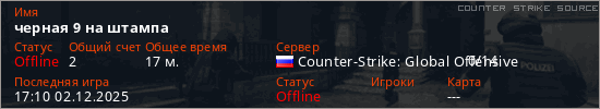 Играет на Counter Strike Source сервере. Страна: РоссияПервый раз замечен 15:28 26.11.2025