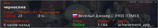 Играет на Team Fortress 2 сервере. Страна: РоссияПервый раз замечен 19:52 24.03.2026