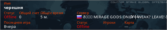 Играет на Counter Strike Global Offensive сервере. Страна: РоссияПервый раз замечен 21:23 05.03.2026