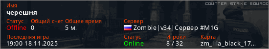 Играет на Counter Strike Source сервере. Страна: РоссияПервый раз замечен 18:43 18.11.2025