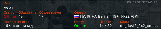 Играет на Counter Strike 1.6 сервере. Страна: РоссияПервый раз замечен 17:26 01.10.2025