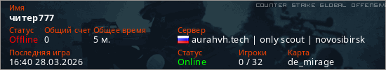 Играет на Counter Strike Global Offensive сервере. Страна: РоссияПервый раз замечен 16:24 28.03.2026