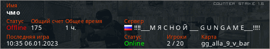 Играет на Counter Strike 1.6 сервере. Страна: РоссияПервый раз замечен 16:34 04.01.2023