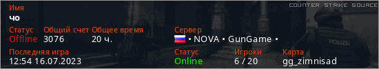 Играет на Counter Strike Source сервере. Страна: РоссияПервый раз замечен 15:31 06.01.2023