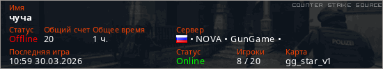 Играет на Counter Strike Source сервере. Страна: РоссияПервый раз замечен 18:07 19.03.2026