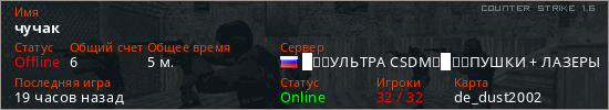 Играет на Counter Strike 1.6 сервере. Страна: РоссияПервый раз замечен 00:48 07.03.2026