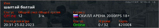Играет на Counter Strike 1.6 сервере. Страна: РоссияПервый раз замечен 16:37 25.02.2023