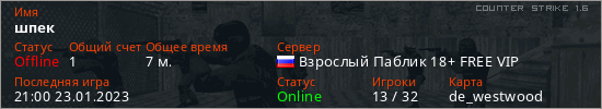Играет на Counter Strike 1.6 сервере. Страна: РоссияПервый раз замечен 20:56 23.01.2023