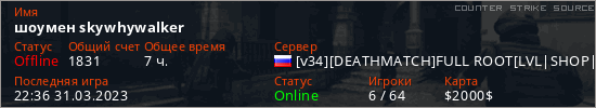 Играет на Counter Strike Source сервере. Страна: РоссияПервый раз замечен 11:51 11.02.2023