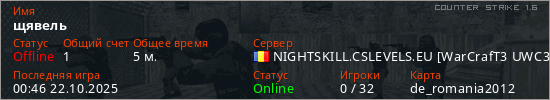 Играет на Counter Strike 1.6 сервере. Страна: РумынияПервый раз замечен 00:44 22.10.2025