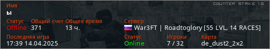 Последний раз был в сети 17:39 14.04.2025 Игрок с таким ником замечен на 41 сервере