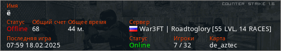 Играет на Counter Strike 1.6 сервере. Страна: РоссияПервый раз замечен 00:22 25.06.2022