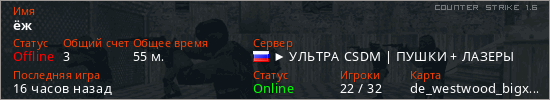Играет на Counter Strike 1.6 сервере. Страна: РоссияПервый раз замечен 20:14 08.04.2024