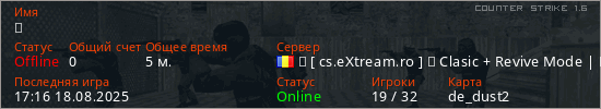 Играет на Counter Strike 1.6 сервере. Страна: РумынияПервый раз замечен 17:08 18.08.2025