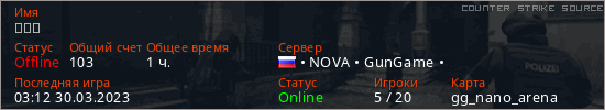 Играет на Counter Strike Source сервере. Страна: РоссияПервый раз замечен 20:47 16.03.2023