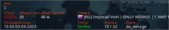 Играет на Counter Strike Global Offensive сервере. Страна: РоссияПервый раз замечен 03:48 09.08.2025