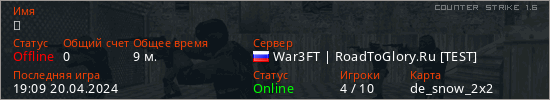 Играет на Counter Strike 1.6 сервере. Страна: РоссияПервый раз замечен 18:59 20.04.2024