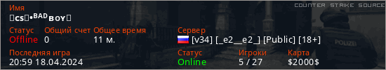 Играет на Counter Strike Source сервере. Страна: РоссияПервый раз замечен 11:03 31.03.2024