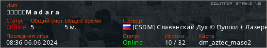 Играет на Counter Strike 1.6 сервере. Страна: РоссияПервый раз замечен 08:24 06.06.2024
