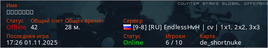 Играет на Counter Strike Global Offensive сервере. Страна: РоссияПервый раз замечен 19:54 30.10.2025