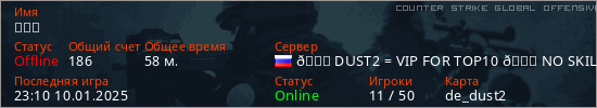 Играет на Counter Strike Global Offensive сервере. Страна: РоссияПервый раз замечен 10:54 25.12.2024