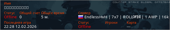 Играет на Counter Strike Global Offensive сервере. Страна: РоссияПервый раз замечен 22:20 12.02.2026