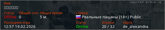 Играет на Counter Strike 1.6 сервере. Страна: РоссияПервый раз замечен 12:49 19.02.2026