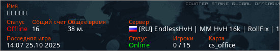 Играет на Counter Strike Global Offensive сервере. Страна: РоссияПервый раз замечен 23:05 20.09.2025