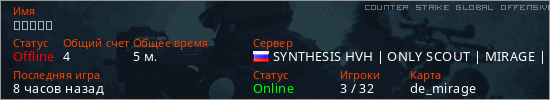 Играет на Counter Strike Global Offensive сервере. Страна: РоссияПервый раз замечен 15:24 30.01.2026
